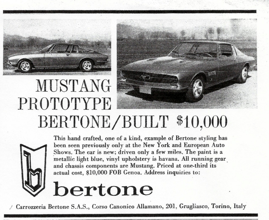 Scott Bailey, the founder and editor at Automobile Quarterly magazine commissioned the world famous Bertone to redesing and rebody the Mustang for the 1965 New York International Automobile show. So they did. And won Best of Show award in New York.