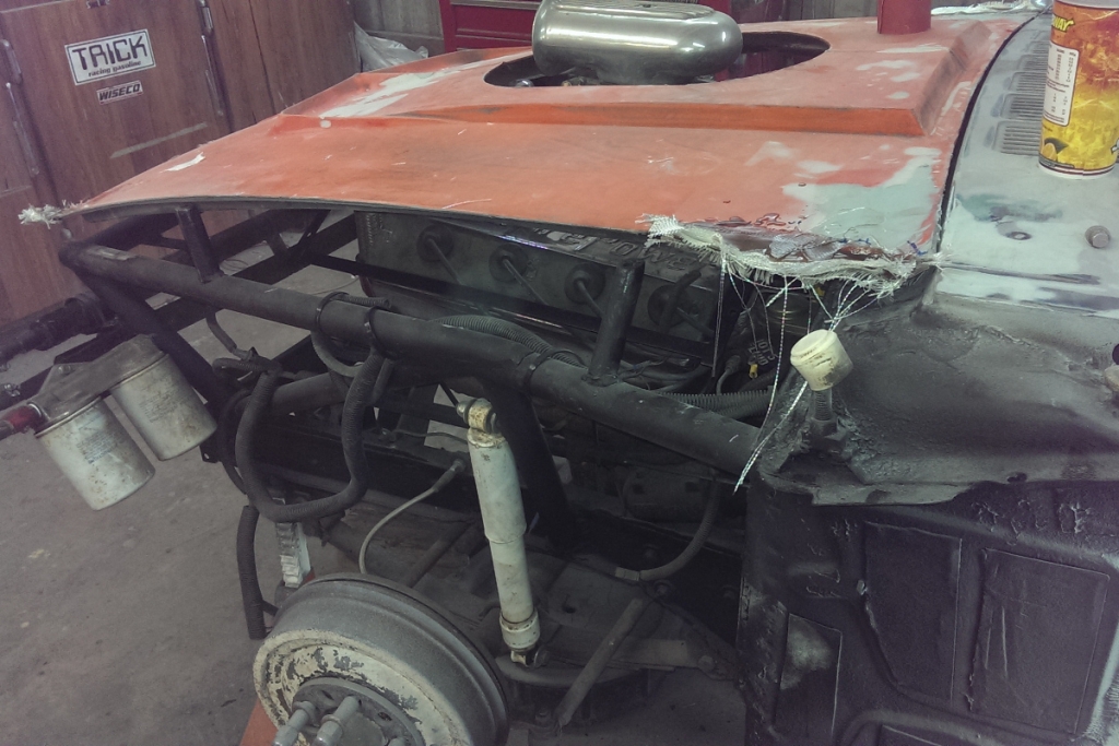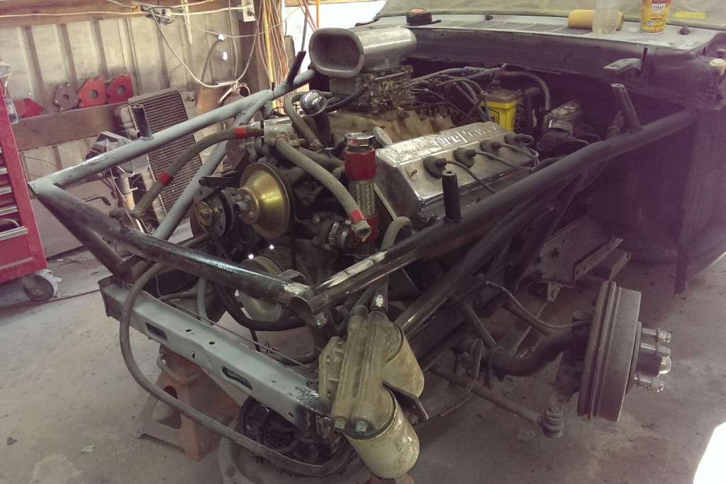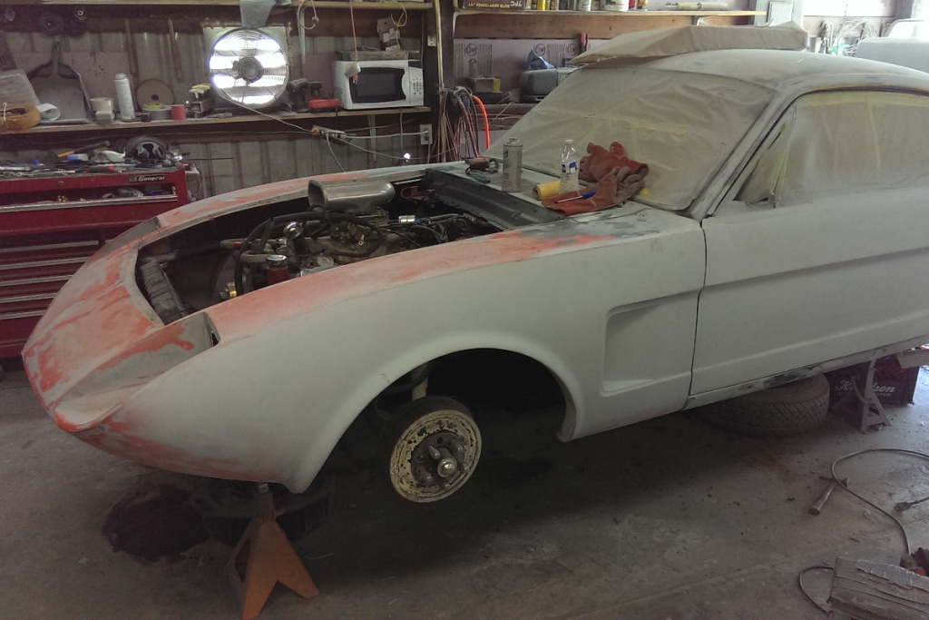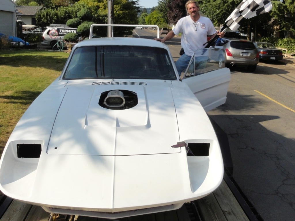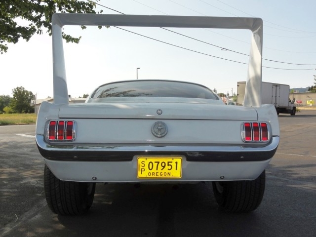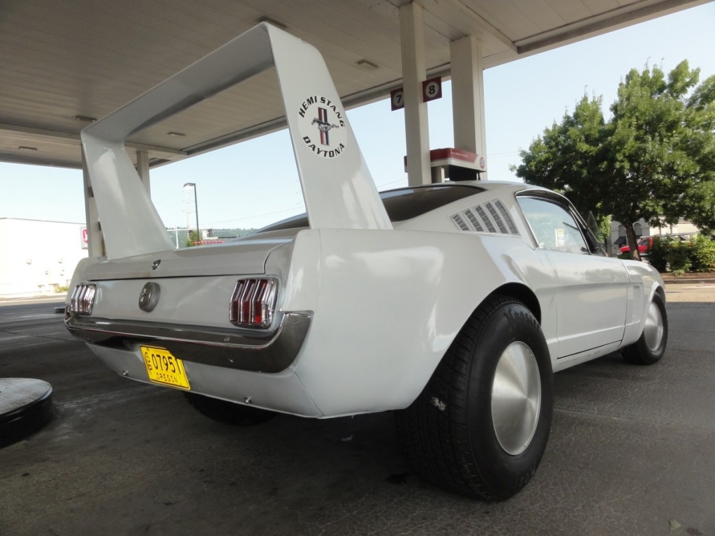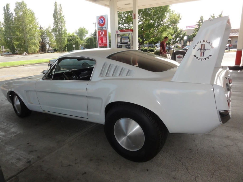 Yes. This is a ’66 1/2 Mustang Fastback with Daytona’s exterior features and… 354 cubic Hemi from 1956. 2-speed push-button Chrysler PowerFlite transmission, Ford’s factory 8-inch rear end, clutch, and driveshaft.