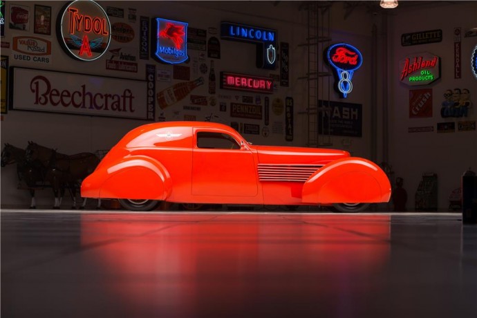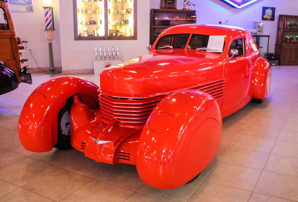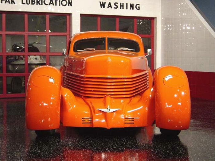 What you see here started its life as 4 door 1937 Cord Westchester that was salvaged 10 years after. Yeap, salvaged. 20 more years later one guy found it bought it out of the salvage yard and customized it heavily instead of simply (and very epensively) restoring this Cord. So, here we go – now we have a 2-door coupe Westchester with LT1 Chevy engine. Big like.